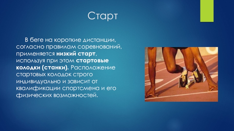 В беге на короткие дистанции, согласно правилам соревнований, применяется низкий старт,