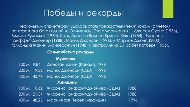 бега) одной из Олимпиад. Это американцы — Джесси Оуэнс (1936), Вильма Рудольф (1960), Карл Льюис и Валери Бриско-Хукс (1984), Флоренс Гриффит-Джойнер (1988), Майкл Джонсон (1996), и Мэрион Джонс (2000), голландка Фанни Бланкерс-Кун (1948) и австралийка Элизабет Катберт (1956).