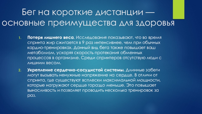 Слайд 15Бег на короткие дистанции — основные преимущества для здоровья