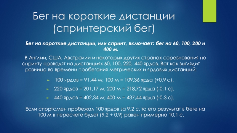 Если спортсмен пробежал 100 ярдов за 9,2 с, то его результат в беге на 100 м в пересчете будет (9,2 + 0,9) равен примерно 10,1 с.
