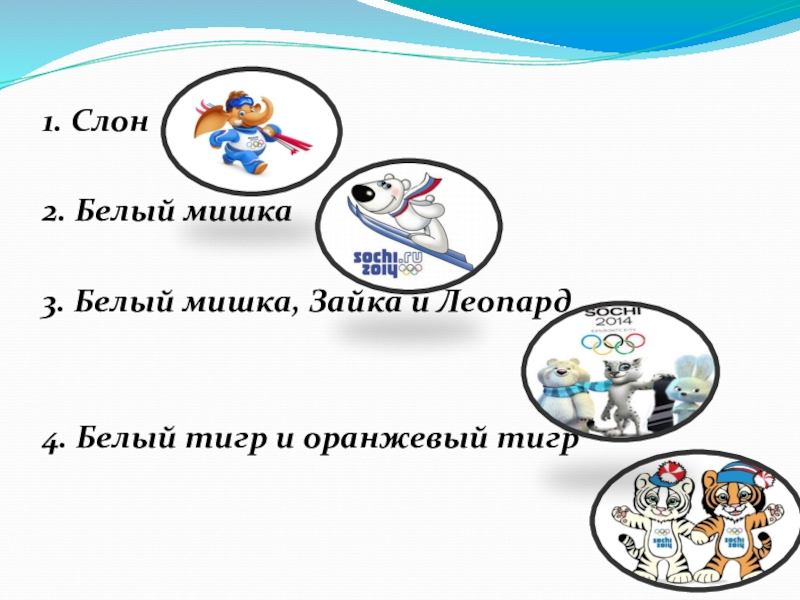 1. Слон2. Белый мишка3. Белый мишка, Зайка и Леопард4. Белый тигр и оранжевый тигр