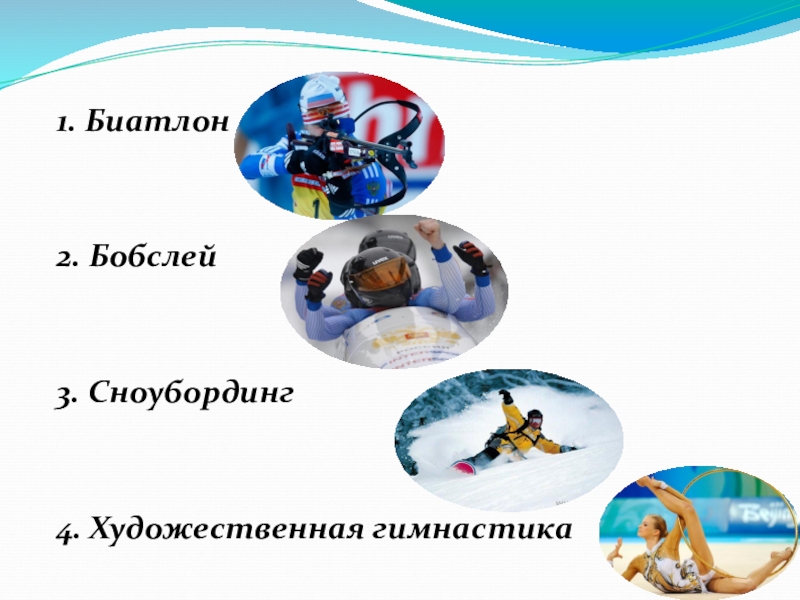 1. Биатлон2. Бобслей3. Сноубординг4. Художественная гимнастика