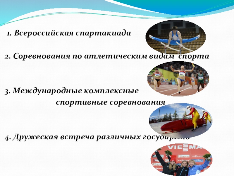 1. Всероссийская спартакиада2. Соревнования по атлетическим видам спорта3. Международные