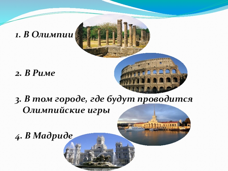 1. В Олимпии2. В Риме3. В том городе, где будут проводится Олимпийские игры 4. В Мадриде