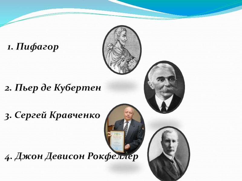 1. Пифагор2. Пьер де Кубертен 3. Сергей Кравченко 4. Джон Девисон Рокфеллер