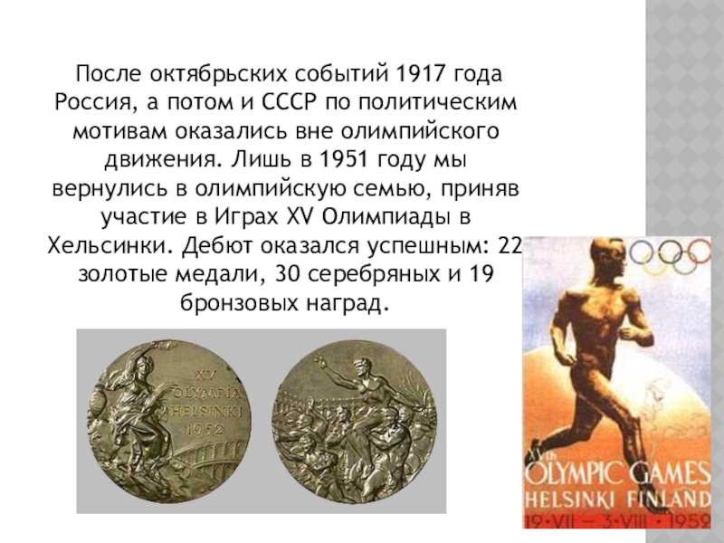 по политическим мотивам оказались вне олимпийского движения. Лишь в 1951 году мы вернулись в олимпийскую семью, приняв участие в Играх XV Олимпиады в Хельсинки. Дебют оказался успешным: 22 золотые медали, 30 серебряных и 19 бронзовых наград.
