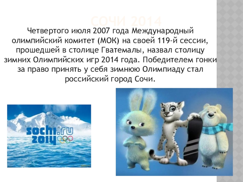 119-й сессии, прошедшей в столице Гватемалы, назвал столицу зимних Олимпийских игр 2014 года. Победителем гонки за право принять у себя зимнюю Олимпиаду стал российский город Сочи.