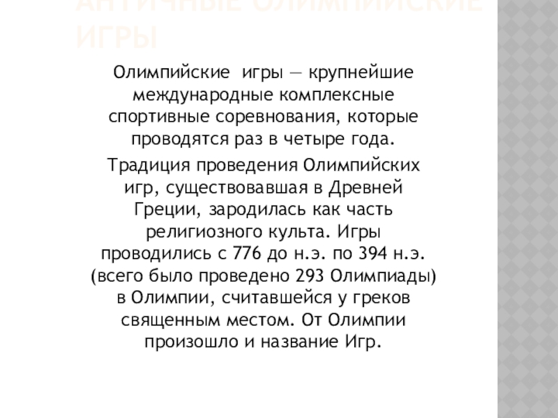 Традиция проведения Олимпийских игр, существовавшая в Древней Греции, зародилась как часть религиозного культа. Игры проводились с 776 до н.э. по 394 н.э. (всего было проведено 293 Олимпиады) в Олимпии, считавшейся у греков священным местом. От Олимпии произошло и название Игр.