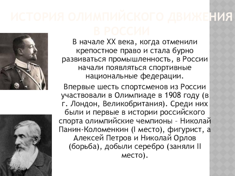 Впервые шесть спортсменов из России участвовали в Олимпиаде в 1908 году (в г. Лондон, Великобритания). Среди них были и первые в истории российского спорта олимпийские чемпионы – Николай Панин-Коломенкин (I место), фигурист, а Алексей Петров и Николай Орлов (борьба), добыли серебро (заняли II место).