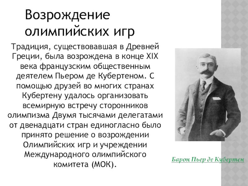 французским общественным деятелем Пьером де Кубертеном. С помощью друзей во многих странах Кубертену удалось организовать всемирную встречу сторонников олимпизма Двумя тысячами делегатами от двенадцати стран единогласно было принято решение о возрождении Олимпийских игр и учреждении Международного олимпийского комитета (МОК).