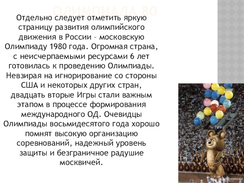 – московскую Олимпиаду 1980 года. Огромная страна, с неисчерпаемыми ресурсами 6 лет готовилась к проведению Олимпиады. Невзирая на игнорирование со стороны США и некоторых других стран, двадцать вторые Игры стали важным этапом в процессе формирования международного ОД. Очевидцы Олимпиады восьмидесятого года хорошо помнят высокую организацию соревнований, надежный уровень защиты и безграничное радушие москвичей.