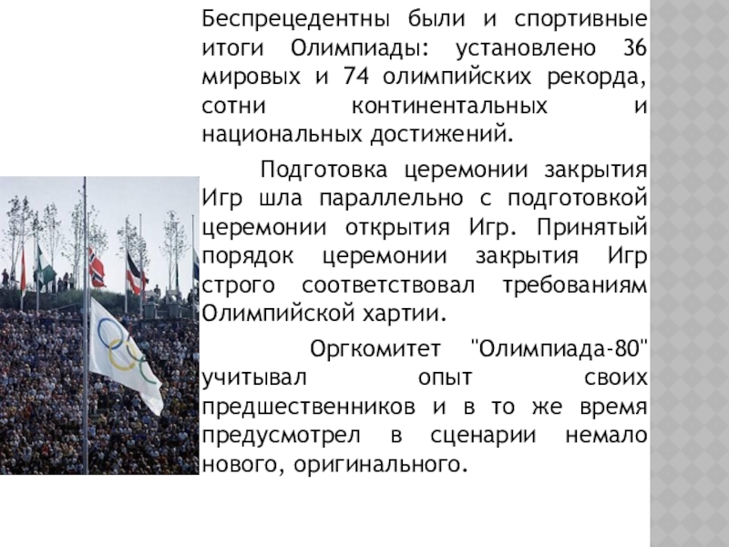 Слайд 12Беспрецедентны были и спортивные итоги Олимпиады: установлено 36 мировых и 74
