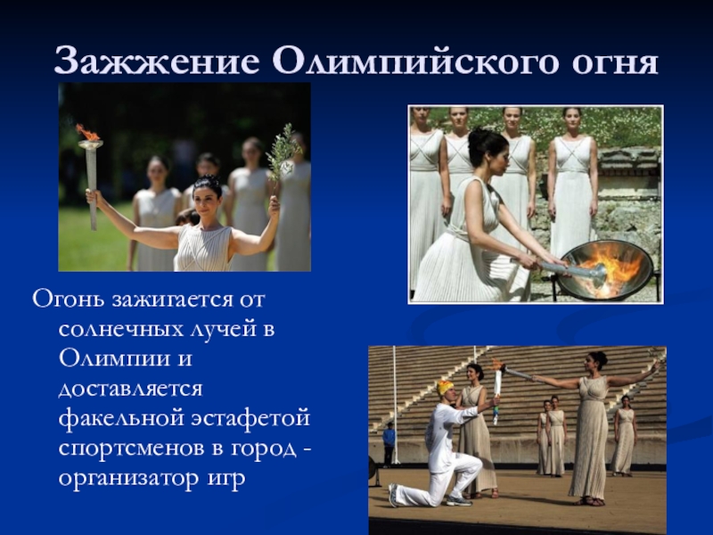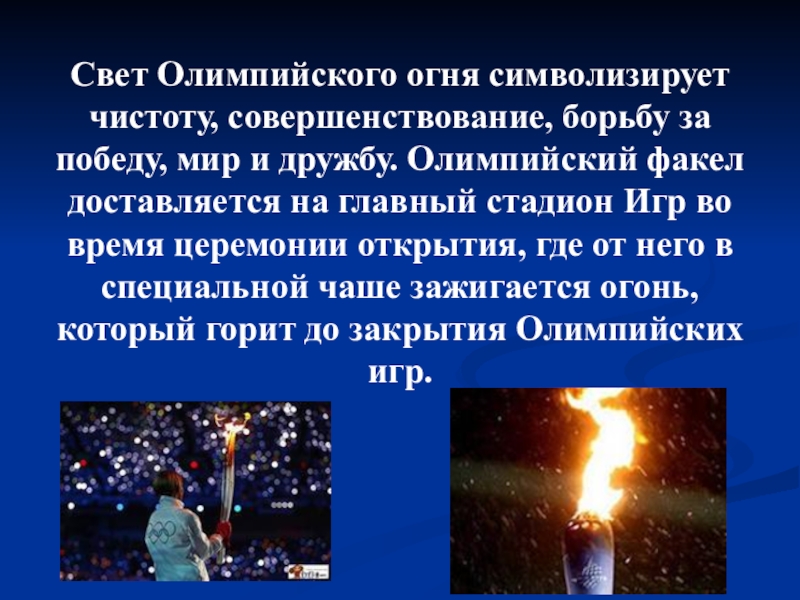 дружбу. Олимпийский факел доставляется на главный стадион Игр во время церемонии открытия, где от него в специальной чаше зажигается огонь, который горит до закрытия Олимпийских игр.