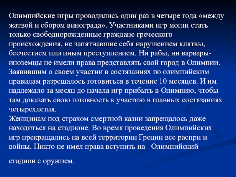 Женщинам под страхом смертной казни запрещалось даже находиться на стадионе. Во время проведения Олимпийских игр прекращались на всей территории Греции все распри и войны. Никто не имел права вступить на Олимпийский стадион с оружием.