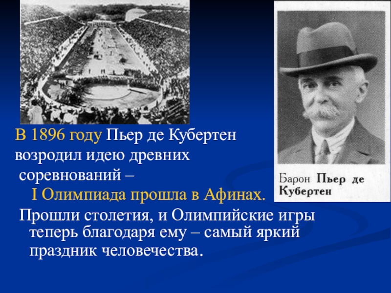 Прошли столетия, и Олимпийские игры теперь благодаря ему – самый яркий праздник человечества.