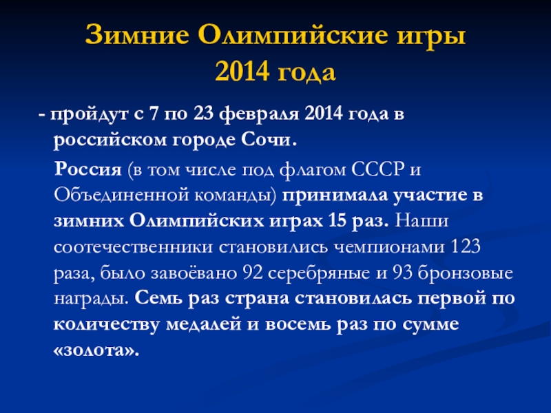 Россия (в том числе под флагом СССР и Объединенной команды) принимала участие в зимних Олимпийских играх 15 раз. Наши соотечественники становились чемпионами 123 раза, было завоёвано 92 серебряные и 93 бронзовые награды. Семь раз страна становилась первой по количеству медалей и восемь раз по сумме «золота».