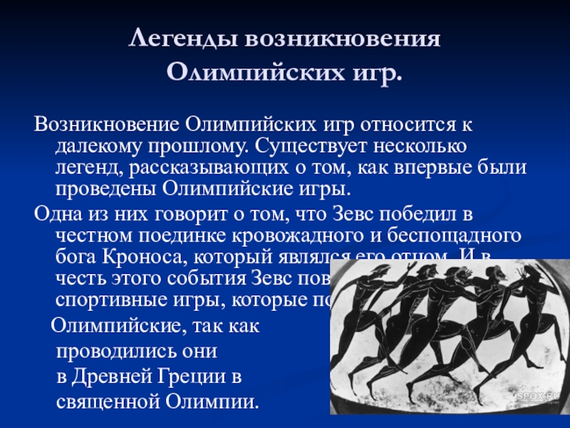 Одна из них говорит о том, что Зевс победил в честном поединке кровожадного и беспощадного бога Кроноса, который являлся его отцом. И в честь этого события Зевс повелел проводить спортивные игры, которые получили название