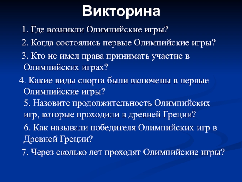 5. Назовите продолжительность Олимпийских игр, которые проходили в древней Греции?