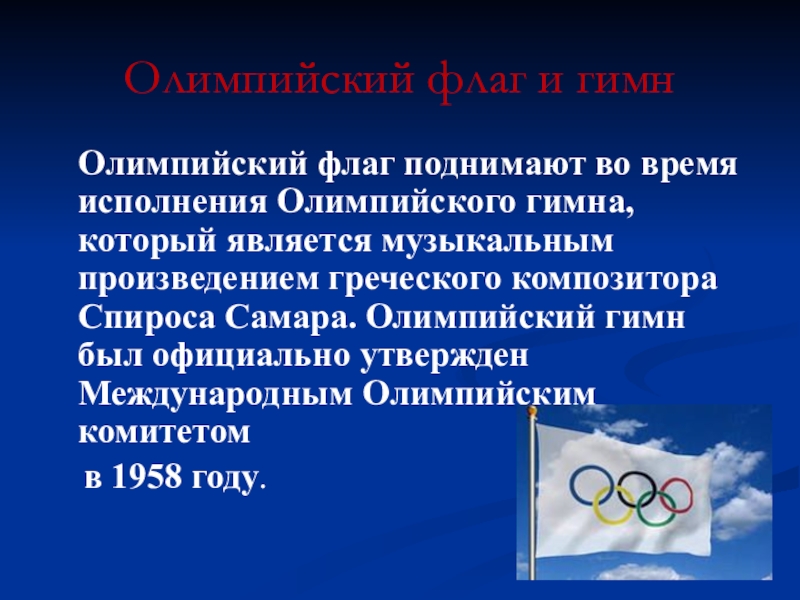 Олимпийского гимна, который является музыкальным произведением греческого композитора Спироса Самара. Олимпийский гимн был официально утвержден Международным Олимпийским комитетом