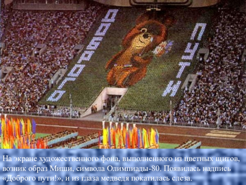 символа Олимпиады-80. Появилась надпись «Доброго пути!», и из глаза медведя покатилась слеза.