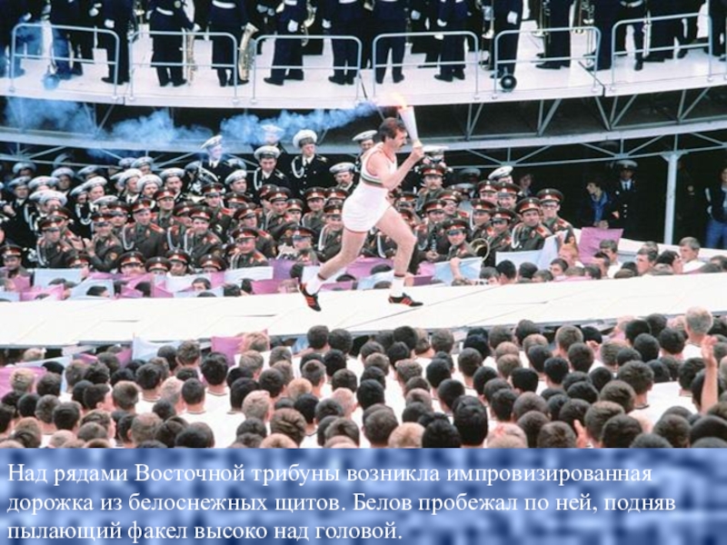 Слайд 14Над рядами Восточной трибуны возникла импровизированная дорожка из белоснежных щитов. Белов