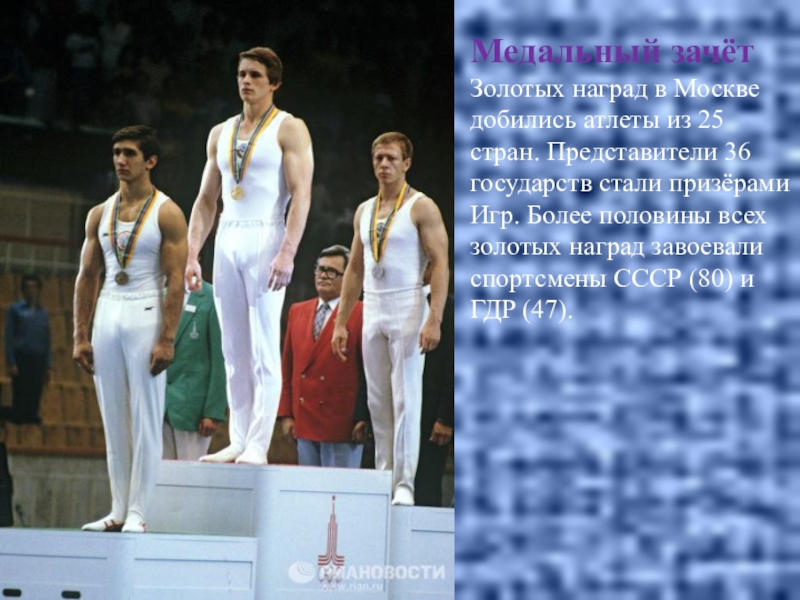 36 государств стали призёрами Игр. Более половины всех золотых наград завоевали спортсмены СССР (80) и ГДР (47).