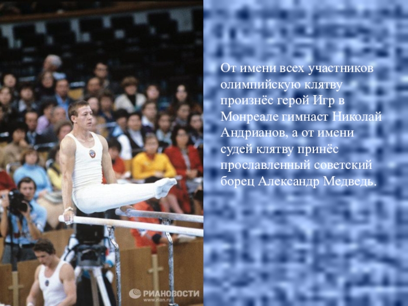 гимнаст Николай Андрианов, а от имени судей клятву принёс прославленный советский борец Александр Медведь.