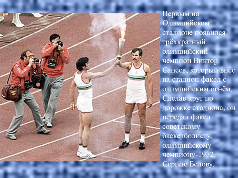 Слайд 13Первым на Олимпийском стадионе появился трёхкратный олимпийский чемпион Виктор Санеев, который