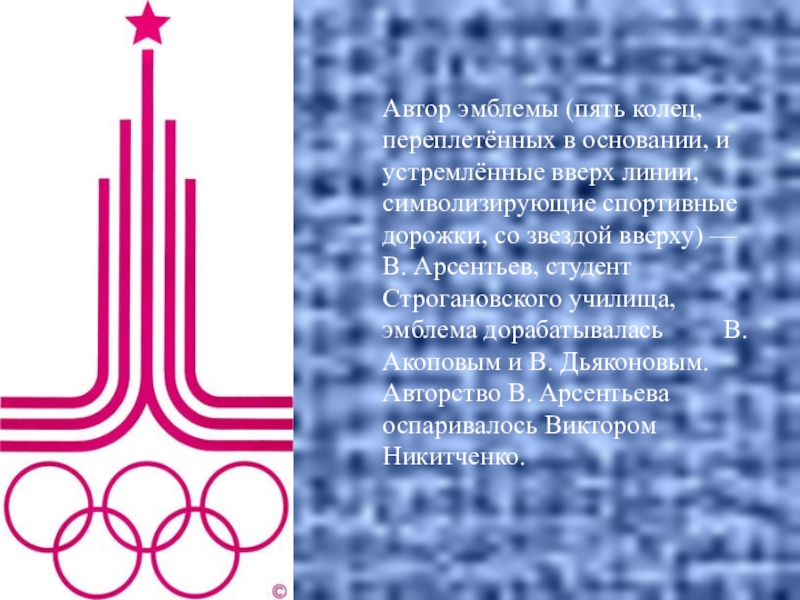 символизирующие спортивные дорожки, со звездой вверху) — В. Арсентьев, студент Строгановского училища, эмблема дорабатывалась В. Акоповым и В. Дьяконовым. Авторство В. Арсентьева оспаривалось Виктором Никитченко.