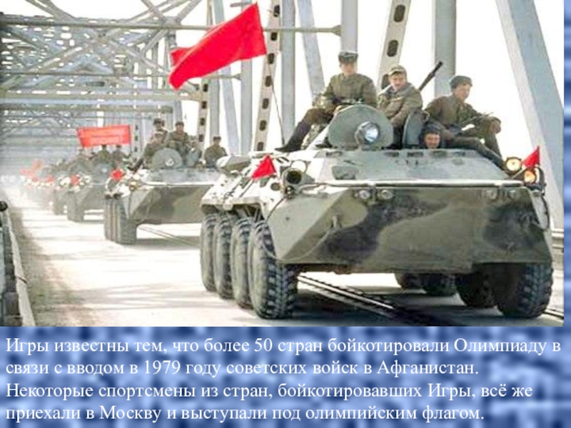 с вводом в 1979 году советских войск в Афганистан. Некоторые спортсмены из стран, бойкотировавших Игры, всё же приехали в Москву и выступали под олимпийским флагом.