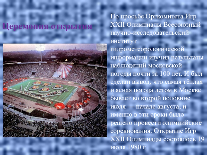 изучил результаты наблюдений московской погоды почти за 100 лет. И был сделан вывод, что самая тёплая и ясная погода летом в Москве бывает во второй половине июля — начале августа, и именно в эти сроки было решено провести олимпийские соревнования. Открытие Игр XXII Олимпиады состоялось 19 июля 1980 г.