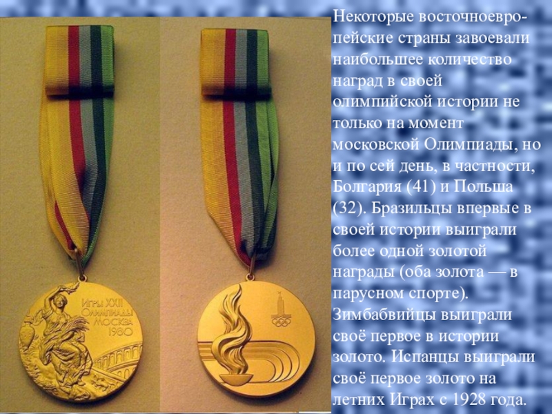 не только на момент московской Олимпиады, но и по сей день, в частности, Болгария (41) и Польша (32). Бразильцы впервые в своей истории выиграли более одной золотой награды (оба золота — в парусном спорте). Зимбабвийцы выиграли своё первое в истории золото. Испанцы выиграли своё первое золото на летних Играх с 1928 года.
