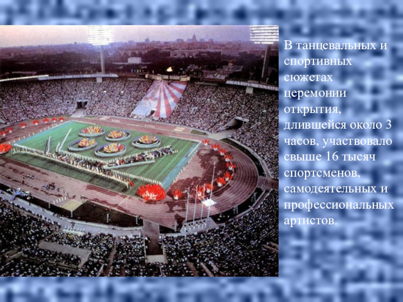 Слайд 18В танцевальных и спортивных сюжетах церемонии открытия, длившейся около 3 часов,