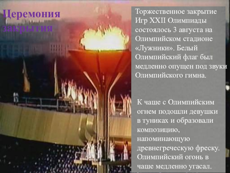 Слайд 21Торжественное закрытие Игр XXII Олимпиады состоялось 3 августа на Олимпийском стадионе