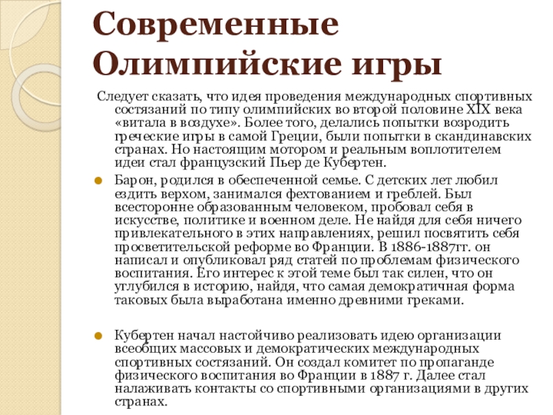 типу олимпийских во второй половине XIX века «витала в воздухе». Более того, делались попытки возродить греческие игры в самой Греции, были попытки в скандинавских странах. Но настоящим мотором и реальным воплотителем идеи стал французский Пьер де Кубертен.