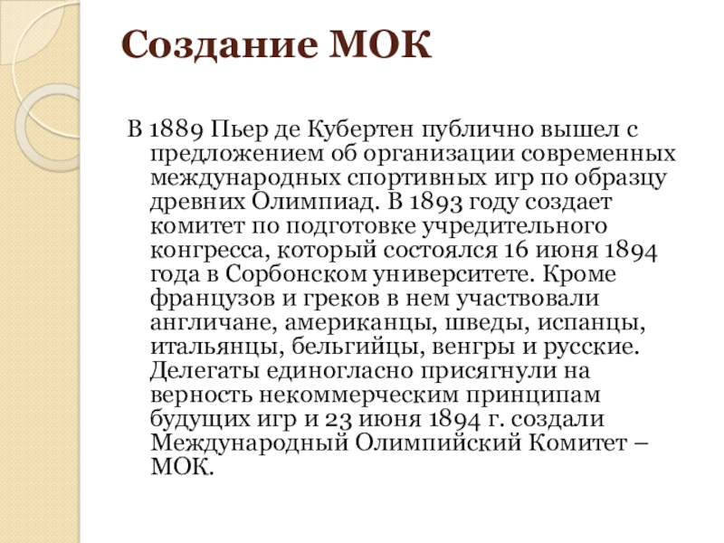 организации современных международных спортивных игр по образцу древних Олимпиад. В 1893 году создает комитет по подготовке учредительного конгресса, который состоялся 16 июня 1894 года в Сорбонском университете. Кроме французов и греков в нем участвовали англичане, американцы, шведы, испанцы, итальянцы, бельгийцы, венгры и русские. Делегаты единогласно присягнули на верность некоммерческим принципам будущих игр и 23 июня 1894 г. создали Международный Олимпийский Комитет – МОК.
