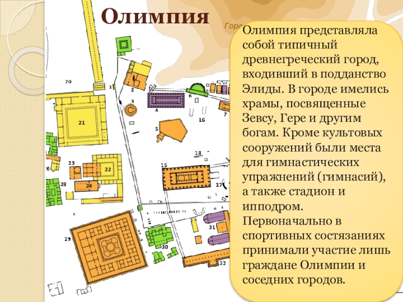 Олимпия представляла собой типичный древнегреческий город, входивший в подданство Элиды. В