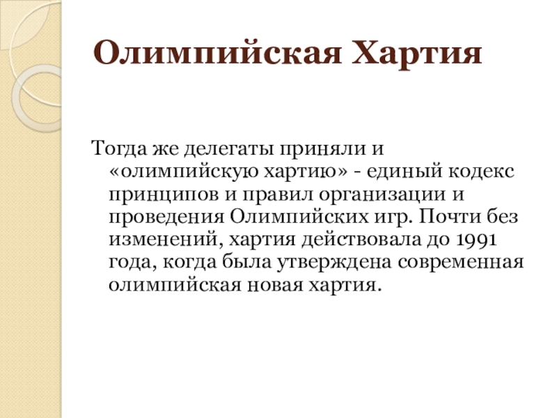 принципов и правил организации и проведения Олимпийских игр. Почти без изменений, хартия действовала до 1991 года, когда была утверждена современная олимпийская новая хартия.