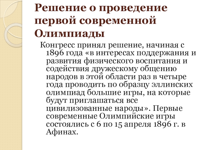года «в интересах поддержания и развития физического воспитания и содействия дружескому общению народов в этой области раз в четыре года проводить по образцу эллинских олимпиад большие игры, на которые будут приглашаться все цивилизованные народы». Первые современные Олимпийские игры состоялись с 6 по 15 апреля 1896 г. в Афинах.