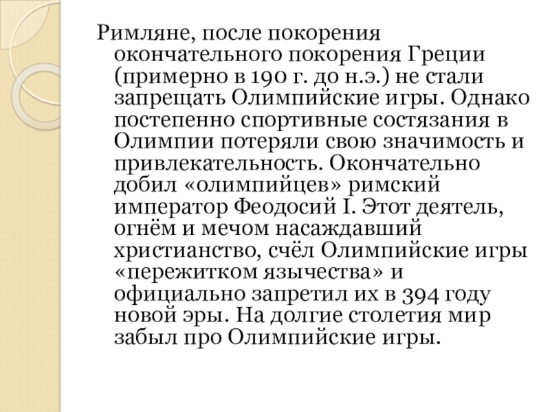 н.э.) не стали запрещать Олимпийские игры. Однако постепенно спортивные состязания в Олимпии потеряли свою значимость и привлекательность. Окончательно добил «олимпийцев» римский император Феодосий I. Этот деятель, огнём и мечом насаждавший христианство, счёл Олимпийские игры «пережитком язычества» и официально запретил их в 394 году новой эры. На долгие столетия мир забыл про Олимпийские игры.