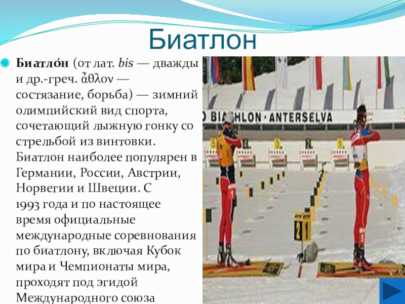 вид спорта, сочетающий лыжную гонку со стрельбой из винтовки. Биатлон наиболее популярен в Германии, России, Австрии, Норвегии и Швеции. C 1993 года и по настоящее время официальные международные соревнования по биатлону, включая Кубок мира и Чемпионаты мира, проходят под эгидой Международного союза биатлонистов