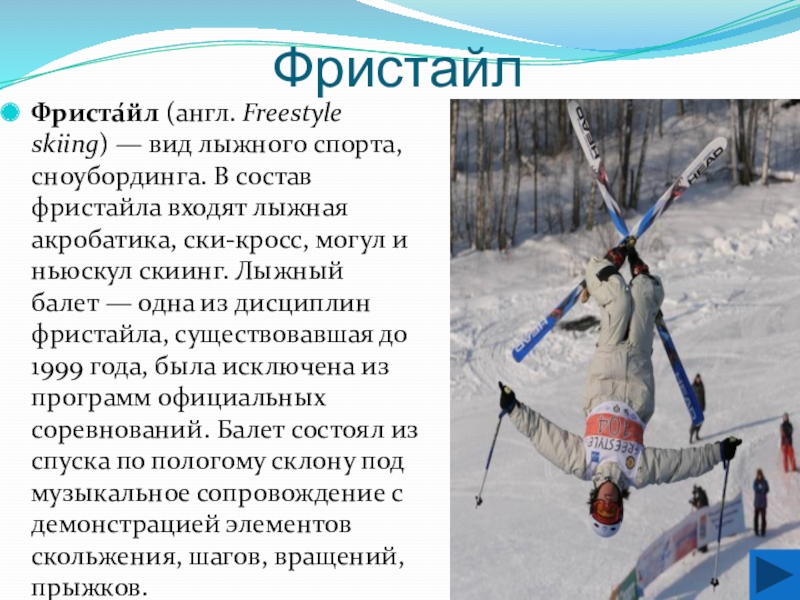 лыжная акробатика, ски-кросс, могул и ньюскул скиинг. Лыжный балет — одна из дисциплин фристайла, существовавшая до 1999 года, была исключена из программ официальных соревнований. Балет состоял из спуска по пологому склону под музыкальное сопровождение с демонстрацией элементов скольжения, шагов, вращений, прыжков.