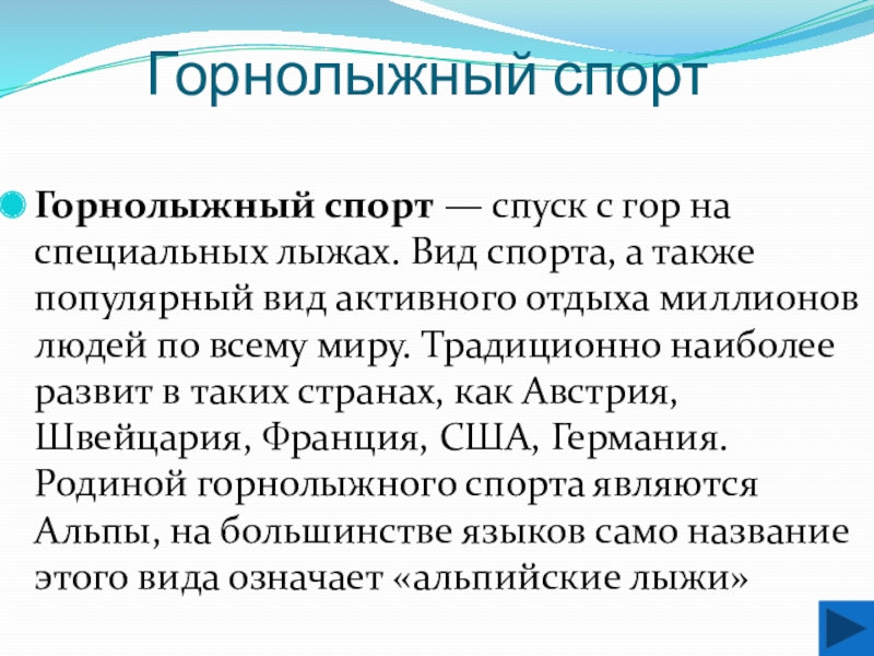 спорта, а также популярный вид активного отдыха миллионов людей по всему миру. Традиционно наиболее развит в таких странах, как Австрия, Швейцария, Франция, США, Германия. Родиной горнолыжного спорта являются Альпы, на большинстве языков само название этого вида означает «альпийские лыжи»