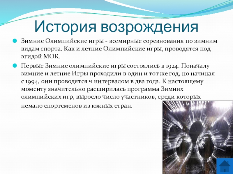 Первые Зимние олимпийские игры состоялись в 1924. Поначалу зимние и летние Игры проходили в один и тот же год, но начиная с 1994, они проводятся ч интервалом в два года. К настоящему моменту значительно расширилась программа Зимних олимпийских игр, выросло число участников, среди которых немало спортсменов из южных стран.