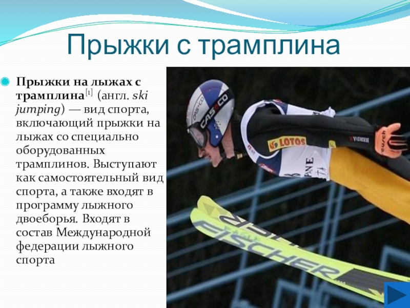 включающий прыжки на лыжах со специально оборудованных трамплинов. Выступают как самостоятельный вид спорта, а также входят в программу лыжного двоеборья. Входят в состав Международной федерации лыжного спорта