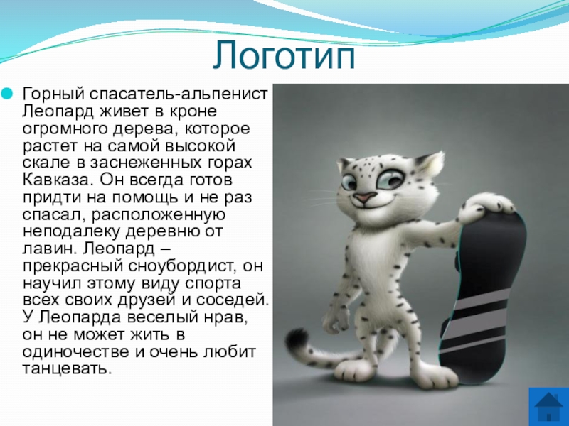 самой высокой скале в заснеженных горах Кавказа. Он всегда готов придти на помощь и не раз спасал, расположенную неподалеку деревню от лавин. Леопард – прекрасный сноубордист, он научил этому виду спорта всех своих друзей и соседей. У Леопарда веселый нрав, он не может жить в одиночестве и очень любит танцевать.