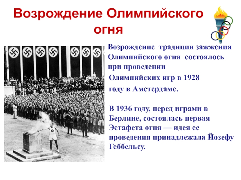 В 1936 году, перед играми в Берлине, состоялась первая Эстафета огня — идея ее проведения принадлежала Йозефу Геббельсу.