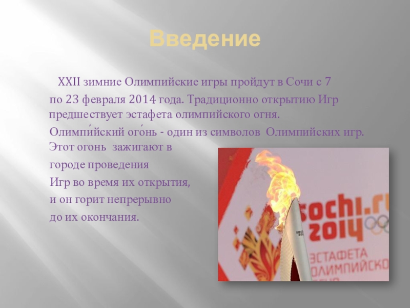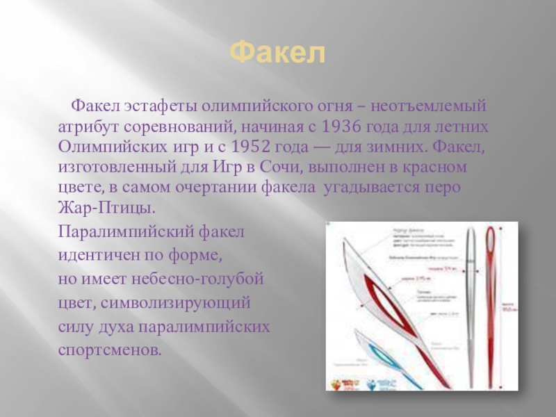 соревнований, начиная с 1936 года для летних Олимпийских игр и с 1952 года — для зимних. Факел, изготовленный для Игр в Сочи, выполнен в красном цвете, в самом очертании факела угадывается перо Жар-Птицы.