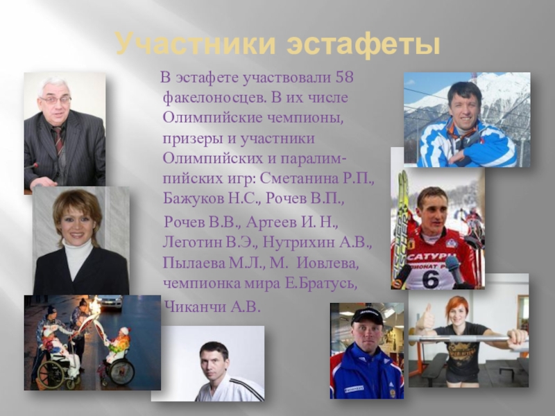 числе Олимпийские чемпионы, призеры и участники Олимпийских и паралим-пийских игр: Сметанина Р.П., Бажуков Н.С., Рочев В.П.,