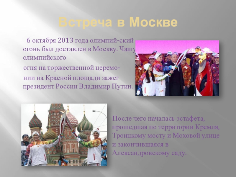 олимпий-ский огонь был доставлен в Москву. Чашу олимпийского
